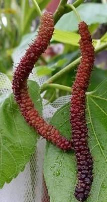 Mulberry. A dwarf cultivar with 10cm long sweet red fruit that have a flavour likened to strawberries. Deciduous.