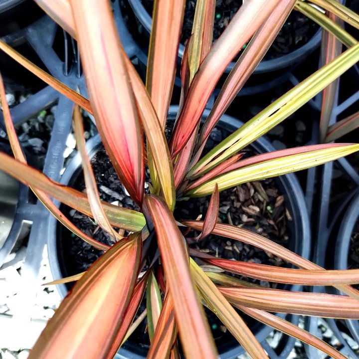 Phormium Rainbow Sunrise is a vibrant variety of New Zealand flax. The leaves boast a kaleidoscope of colours ranging from rich burgundy to blush pink with vibrant yellow edges, resembling a sunrise's colour palette. This striking specimen typically reaches a height and width of 80-100cm, forming an upright, fan-shaped clump. It thrives best in full sun to light shade and prefers well-drained soil, while being drought-tolerant once established. Rainbow Sunrise is often used as a focal point due to its bold, vibrant foliage, serving beautifully in borders, containers, or waterside plantings.