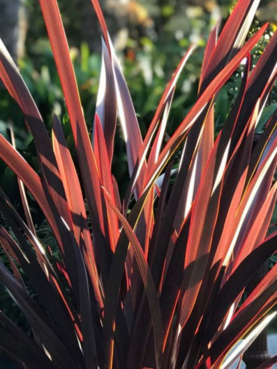Phormium Royal Flush is a striking evergreen New Zealand Flax with vibrant red and bronze foliage. The plant's sword-like leaves create a dramatic visual impact, perfect for adding texture and color contrast in mixed borders, rockeries, or as a standalone feature.