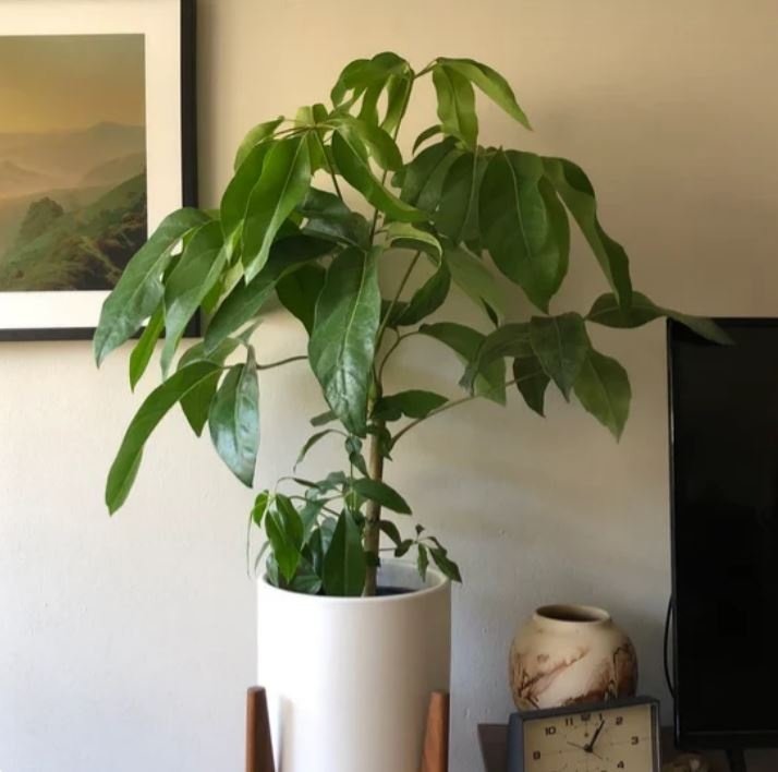 Schefflera amate, commonly known as the Umbrella Tree, is a striking indoor plant known for its large, glossy green leaves that radiate in a graceful, umbrella-like pattern. Its lush and vibrant foliage adds a tropical touch. This hardy plant is low-maintenance and an excellent air purifier, ideal for creating a fresh and inviting indoor environment.