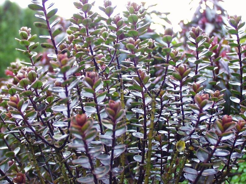 Hebe Champion is a small, compact hebe which was bred in Europe. It has an open, upright habit, growing to about 40 cm high and 40 cm wide. Its small, rounded, cup-shaped leaves are a glossy, deep-olive green on the upper surface and deep maroon underneath. Leaves turn purple in winter. Violet flowers, fading white appear in late spring to summer. This introduced hebe cultivar has Hebe ‘Autumn Glory’ as a parent and is the subject of Plant Breeder Rights 10651.