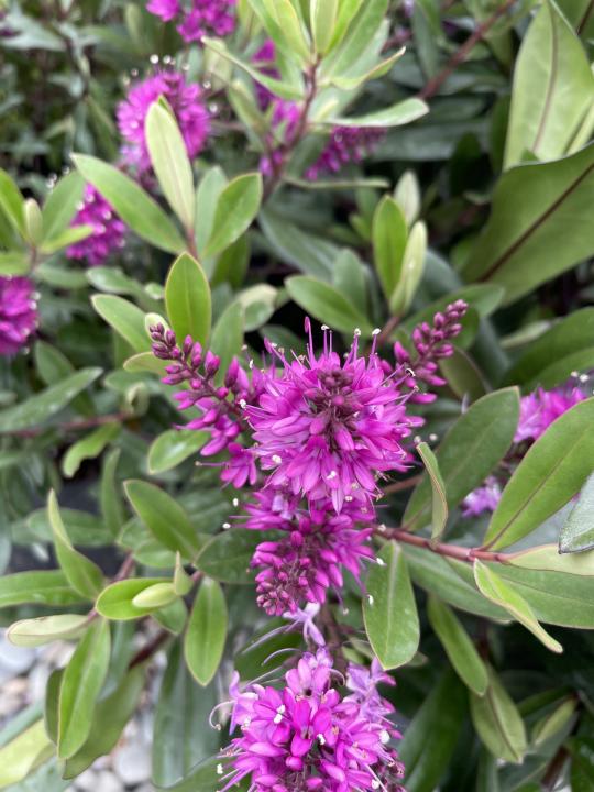 Hebe Inspiration - a compact, spreading shrub smothered in purple flowers. Height - 75cm