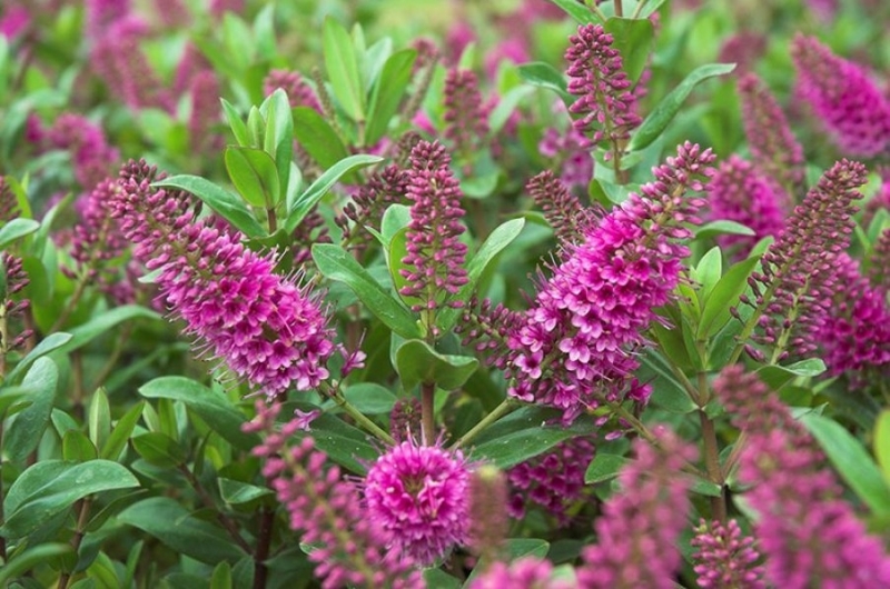 Hebe Sunset Boulevard is a compact, evergreen shrub with an excellent globe-shaped habit, even at a young age. When ageing the plant will grow a little broader. Eventually, it will reach a height and width of about 80 cm. The healthy foliage is fresh green and more resistant than many other hebes to fungal issues that dog many hebe varieties. In spring the bright purple-pink flowers appear in dense racemes. The flowers open over a long period throughout summer.