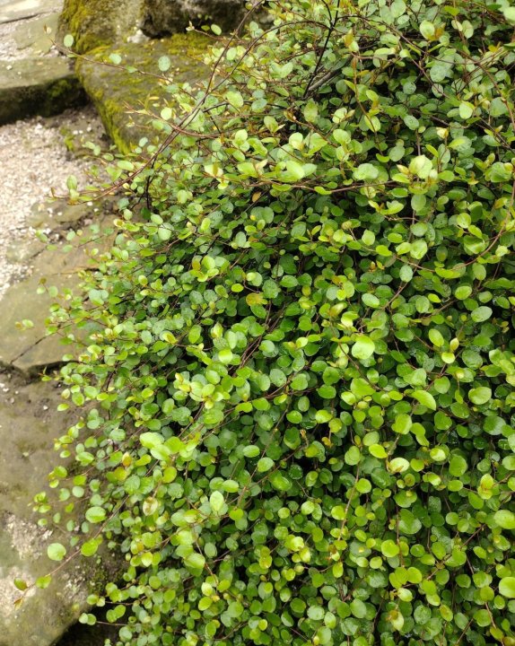 Muehlenbeckia complexa. Known as pohuehue or maidenhair vine. A sprawling, coastal groundcover that grows into a tangled mass of brown, wiry stems with small round leaves and small cream flowers. Pohuehue is found naturally on sand dunes throughout New Zealand. It will form a dense mound or will climb over other plants. Fast-growing and used in coastal restoration, it can be trained as a climber on a wire. It reaches a height of 2m and spreads to 3m.