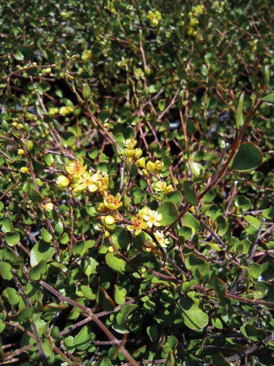 Muehlenbeckia complexa Nana is a sprawling, native ground cover with a tight growing, carpet-like appearance. Produces tiny, round, green leaves with small cream flowers. Performs best in a sunny environment. Very hardy. Grows to 1.5m wide and 0.3m high.