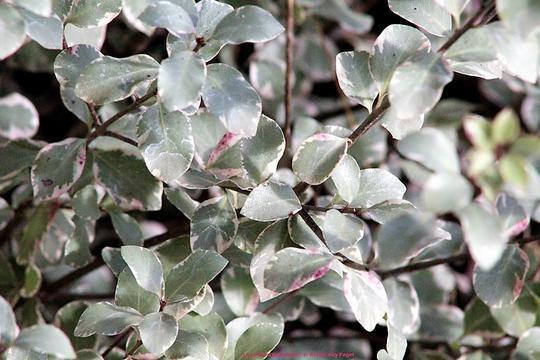 Pale, silvery-green leaves. Leaves become tinged pink in winter. Sparse chocolate-purple flowers. Grows to 2-3m high and wide.