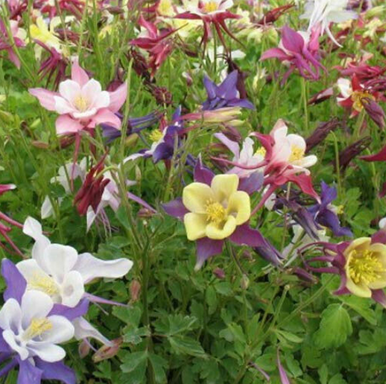 Aquilegia Dragonfly is a striking columbine variety featuring elegant, long-spurred flowers in a range of vivid bi-colours, including deep purples, blues, pinks, and whites. Flowering from late spring to early summer, the intricate blooms rise gracefully above soft, lacy foliage, adding height and visual interest to mixed borders and garden beds.