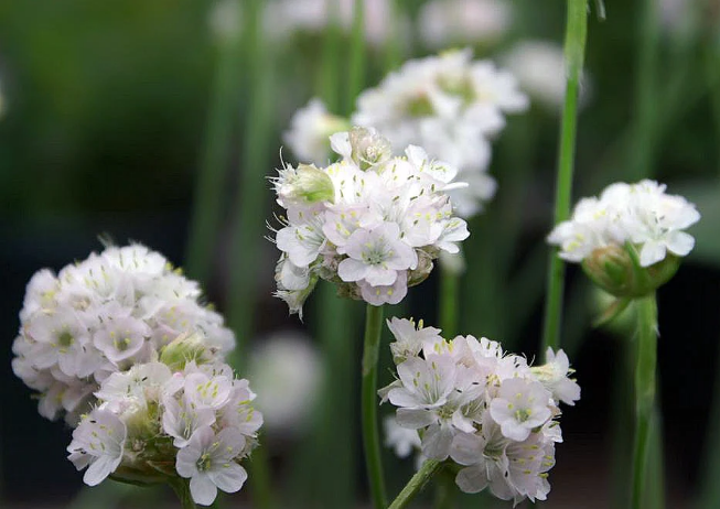 Armeria maritima Alba, often referred to as thrift, stands as a compact perennial distinguished by its dense tufts of stiff, grass-like dark green leaves. In mid-spring, it adorns itself with white flowers that bloom in globular clusters, elevated on slender stalks surpassing the foliage. While its primary bloom season is spring, occasional flowering can be observed throughout the summer. This adaptable plant thrives in a variety of soil conditions, provided they are well-drained, and serves as an attractive hub for bees and butterflies. Its evergreen nature and resilience make it an ideal choice for paths, pots, borders, rockeries, and even seaside gardens as the name suggests. Grows to a height and spread of 15 to 25 cm.