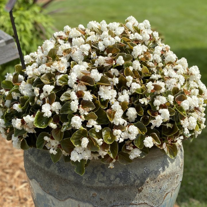 Perfect for cottage, tropical, or contemporary garden styles, Begonia Double Up White is ideal for containers, hanging baskets, underplanting, or shaded borders. It thrives in partial to full shade with moist, free-draining soil and benefits from regular feeding and deadheading. Protect from frost and strong afternoon sun. Space approximately 25-30 cm apart for best coverage.