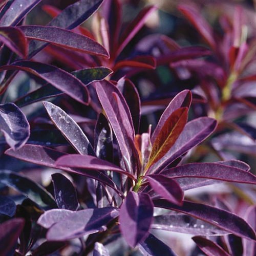 Euphorbia dulcis 'Chameleon' is a compact, clump-forming perennial grown for its striking burgundy-purple foliage that deepens in colour through spring and early summer. In late spring, it produces small, yellow-green flower heads (cyathia) that contrast with the dark leaves, adding seasonal interest. Reaching around 30 to 40 cm high and wide, it is ideal for cottage, contemporary, woodland, and low-maintenance garden styles.