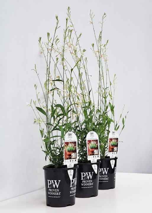 Gaura Soda Pop. Gauras are a true winner for any sunny garden or pot. Once established they are very drought tolerant and keep giving from late spring right through to autumn with an abundance of white flowers. An easy-care plant, that requires a trim at the end of flowering and will keep creating a magnificent display year after year. A real favourite in a new garden as they are so quick to establish. 40cm x 30cm.