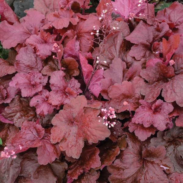 Heuchera Fire Alarm. Rich, deep tones in the striking foliage. Bright-red leaves in spring turning to darker brown-red during the summer. Pale-pink sprays of flowers from spring. Hardy option for containers, borders or planting under trees and shrubs. Prefers some shade and good drainage.