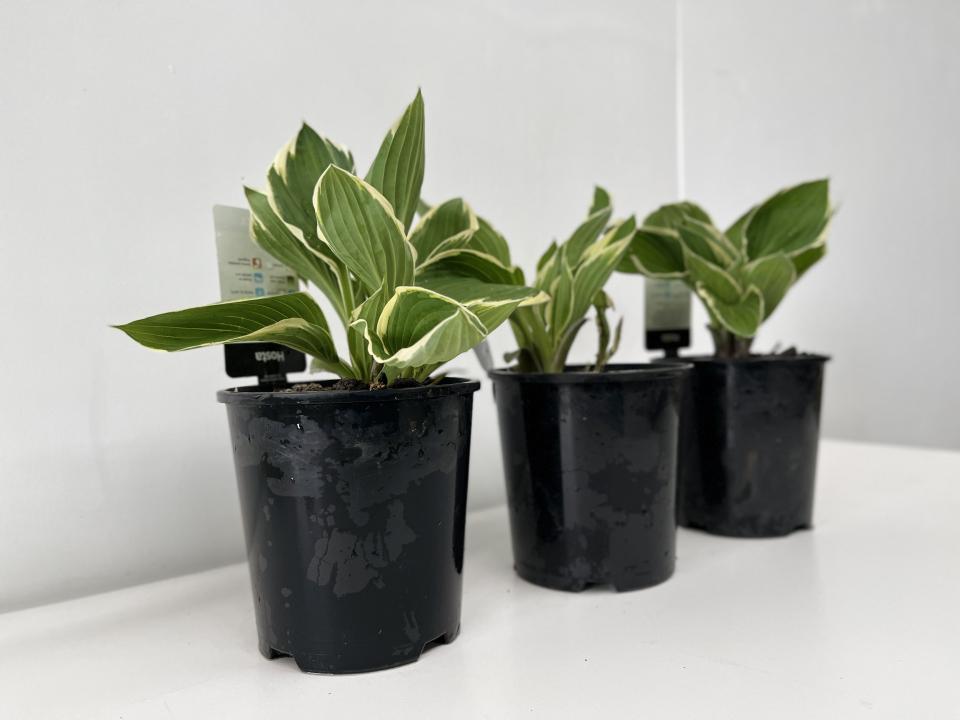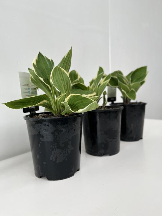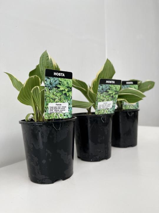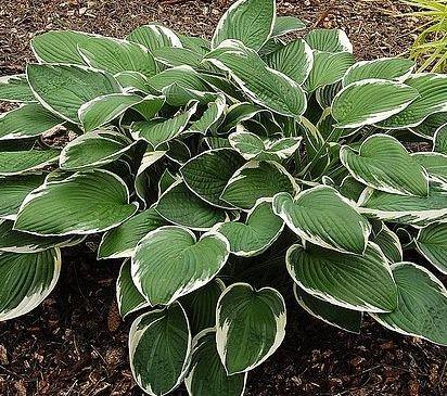 Hosta Francee. Forest-green, heart-shaped leaves edged with narrow, white margins. Lavender flowers in midsummer. The white margin holds up well in full sun as well as shade. A classic hosta, excellent for mass planting and general landscape use.