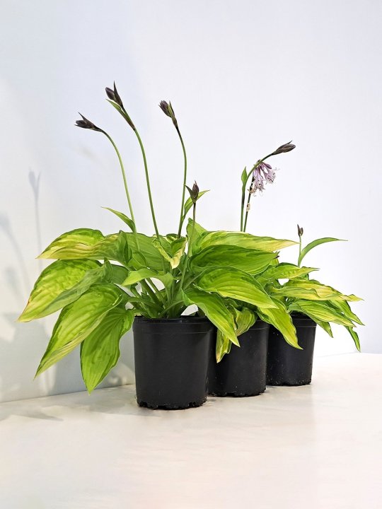 Hosta June is a captivating deciduous perennial celebrated for its striking foliage and versatility in the garden. This Hosta hybrid features heart-shaped leaves with a unique variegation of blue-green margins and gold centres that shift to chartreuse in deeper shade. During the summer, Hosta June produces pale lavender flowers on tall scapes, adding a delicate touch of colour to the garden. As a deciduous plant, it enters a dormant stage during the cooler months, with its foliage dying back until the following spring.