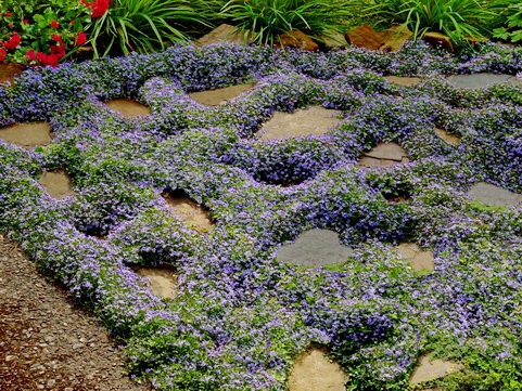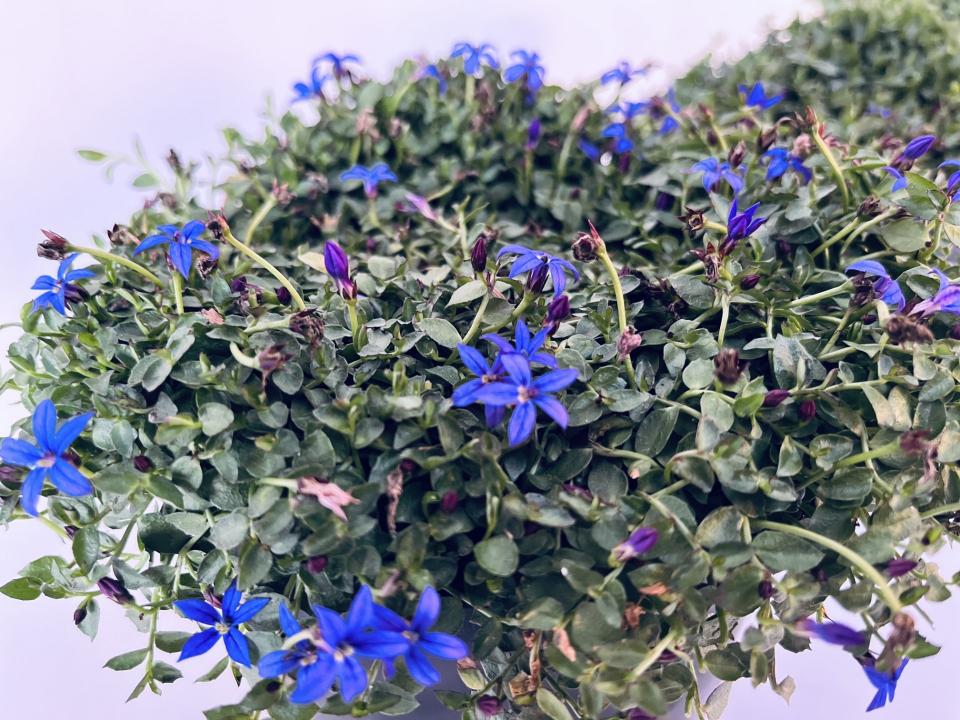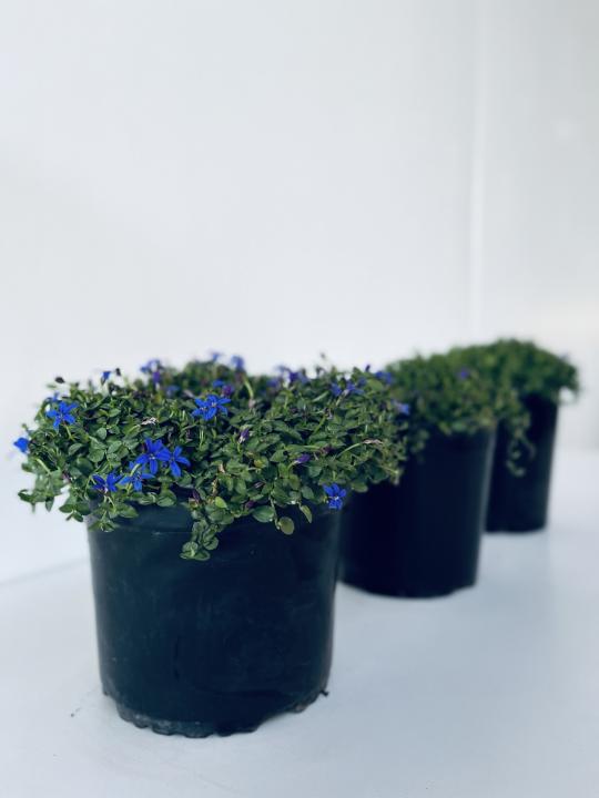 Pratia pedunculata County Park is a cute, small-leafed groundcover with star-like bright-blue flowers. Avoid sunny dry spots in garden. Part shade, well-drained soil. Great for growing in between paving stones and rocks.