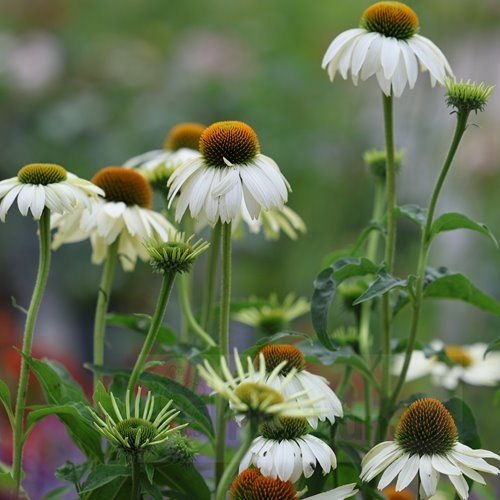 Rudbeckia Primadonna White is a striking perennial featuring large, daisy-like flowers with pure white petals surrounding a prominent greenish-brown central cone. Flowering from mid-summer through to early autumn, it adds bold structure and brightness to garden beds, borders, and cut flower arrangements. With a strong, upright habit reaching around 70-90 cm high and 40-50 cm wide, it brings height and contrast to cottage, prairie, and contemporary garden styles.