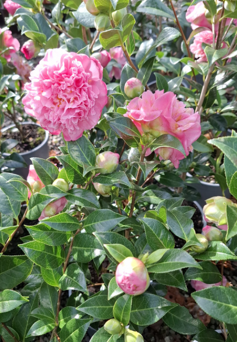 Camellia Ballet Queen has large, salmon-pink, peony blooms, flowering in mid to late spring. It has an pright growth habit and will reach 2-2.5m high and 2m wide. Suitable as specimen shrub, hedging and screening. Happy in sun or part shade – hardy. Plant in good soil with good humus/compost content. Avoid lime.