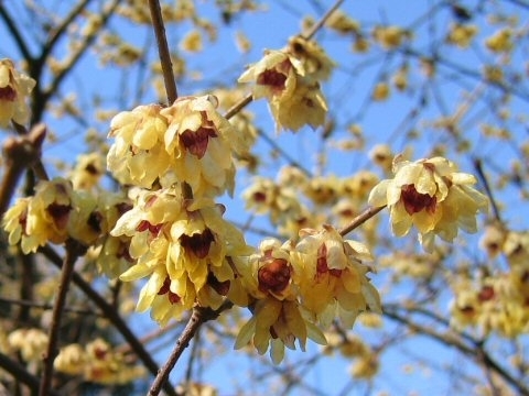Chimonanthus praecox, commonly known as Wintersweet, is a deciduous shrub renowned for its strikingly fragrant, waxy, yellow flowers, which bloom in mid to late winter. These blossoms often appear on bare branches, creating an impressive display against the winter landscape. As spring approaches, the plant dons a cloak of glossy, dark-green leaves, adding further interest.