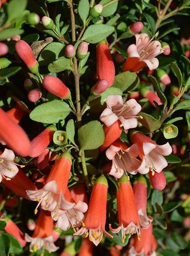 An easy to manage glossy green shrub with a compact and rounded form. Bright coral bell-shaped flowers through the winter and spring. Mass planting as a ground cover with dramatic spring impact.