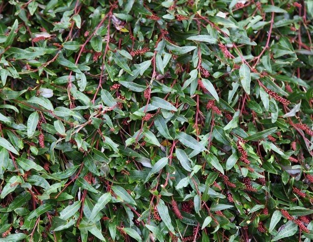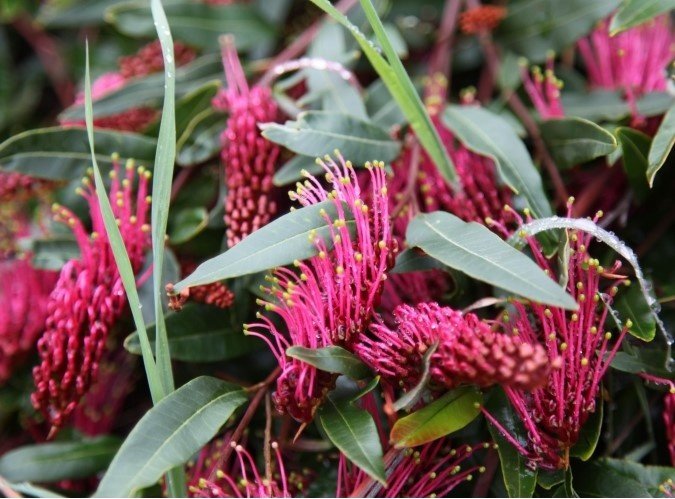 Grevillea Royal Mantle. A fast-growing prostrate, producing dense ground cover with evergreen leaves and dark-red, bottlebrush-like flowers. Fantastic for banks and as a ground cover and in large landscaping areas. Thrives in a sunny position with free-draining soil and can withstand frost to -8C. Grows to approximately 0.3m high and 4 – 6m wide.