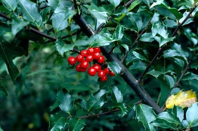 Ilex x meserva Blue Angel. A stunning form of holly of large, dark-green, glossy leaves with a purple-blue hue to them, attached to dark-purple stems. Small ,white flowers bloom in spring which, if pollinated, produce bright-red, shiny berries. These will remain on the plant until early to mid-spring. Position in full sun to semi-shade. Use as a specimen or clip to form a small hedge or screen. Hardy. Evergreen. 2.5m x 2m.
