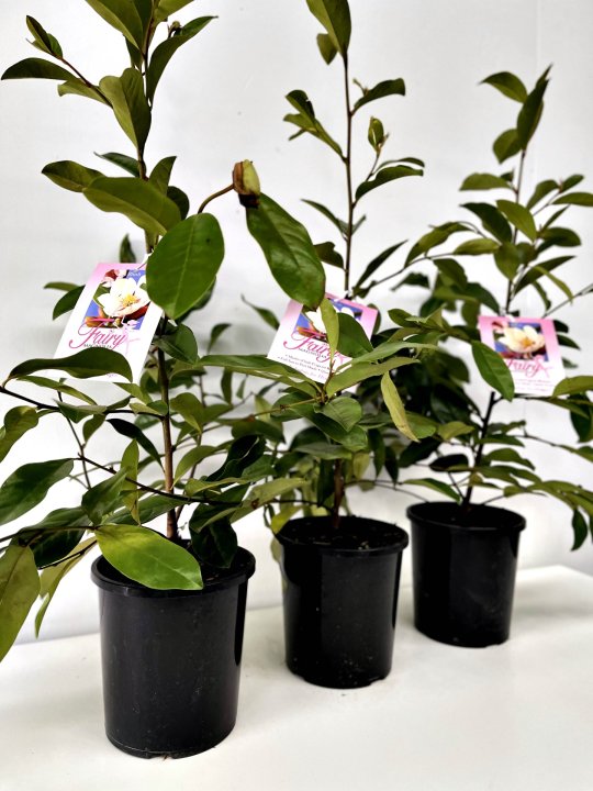 Magnolia Fairy Blush is a compact, evergreen magnolia prized for its softly fragrant, blush-pink flowers that open from slender buds in late Winter through early Spring. The delicate star-shaped flowers contrast beautifully with the glossy green foliage, adding seasonal colour and year-round structure. Its bushy, upright growth makes it ideal for smaller spaces or hedging.