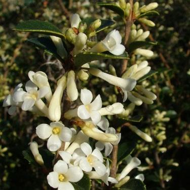 Osmanthus delavayi - a compact-growing, evergreen shrub, with white tubular flowers through summer. Spicy fragrance. Sun or part shade, free draining, deeply-worked neutral to slightly acidic soils.