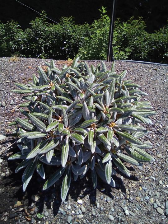 Rhododendron yakushimanum FCC forms a rounded shrub of green leathery leaves with rolled edges and heavy indumentum. Pink flowers fade slowly to white during spring. Hardy plant performs best in part shade. Grows 1m x 1m.