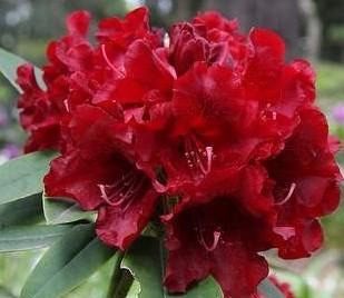 Rhododendron Black Magic bears dark black-red flowers with matt forest-green foliage. Floriferous. One of the best new reds.