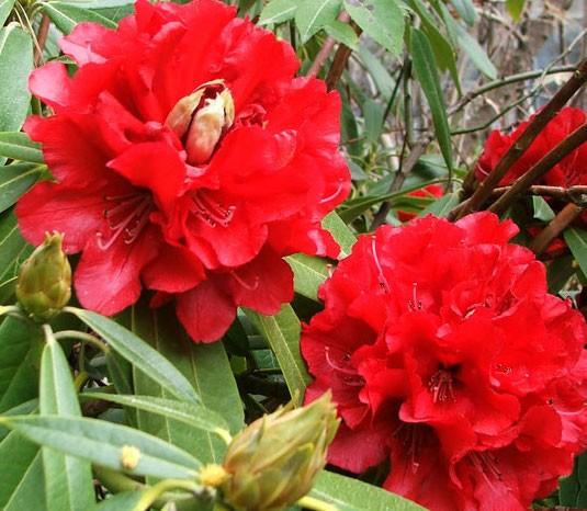Rhododendron Kaponga. Erect grower, tall vigorous habit. 2.5 x 2m. Light green foliage with beautifully shaped, round trusses of clear, shining red.