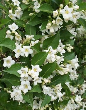 Weigela Snowflake. Light-green foliage with a vigorous habit, the snow-white flowers enhancing the pale foliage. Requires full sun in fertile soils that are moist but free-draining. Prune after flowering. Hardy, deciduous.