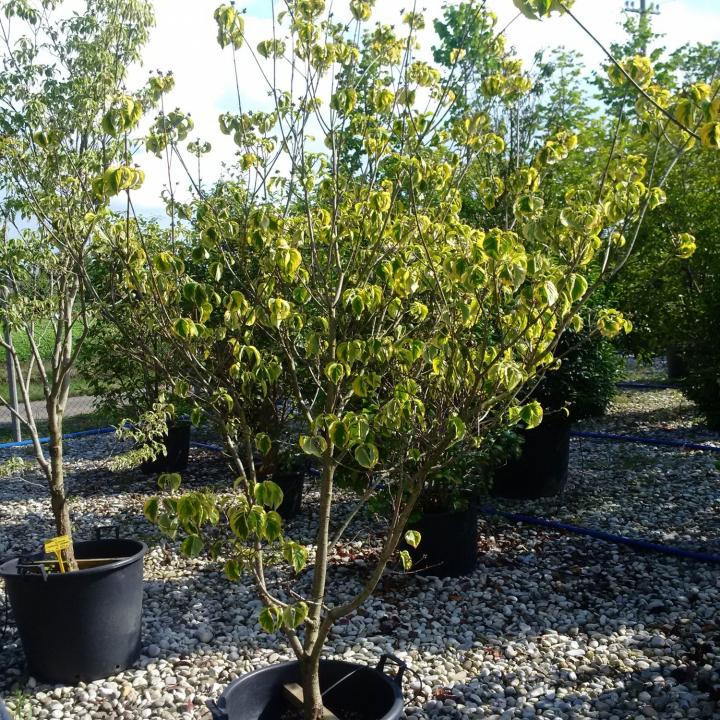 Cornus florida Cherokee Sunset (Flowering Dogwood) is a deciduous tree with moderate growth rate. This tree has green foliage variegated with cream-yellow and pink margins, turning to rose-pink, red and purple autumn colours. Flowers are large, with pink-red tones in spring. Prefers rich, moist, well-drained soils in full to part shade. It can reach up to 4m tall.