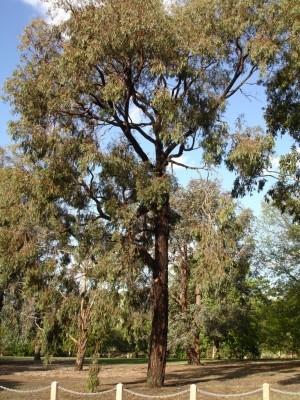 Eucalyptus sideroxylon (Red Ironbark Gum) has a unique red-brown/black bark. This tree is an evergreen fast grower which thrives in full sun in moist, well-drained soils. Up to 15m tall. Low maintenance.