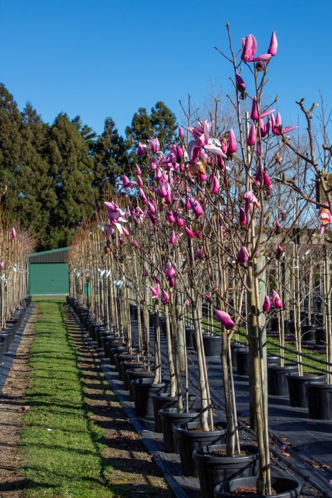 Magnolia Star Wars. Giant tulip-shaped, pale-pink flowers that are flushed with a deeper pink smother the bare branches of this small tree. Once the petals have fallen the glossy green leaves appear. Position in full sun to part shade sheltered from the wind. Suits a well-drained, moist soil. Deciduous. Hardy. 4m x 3m.