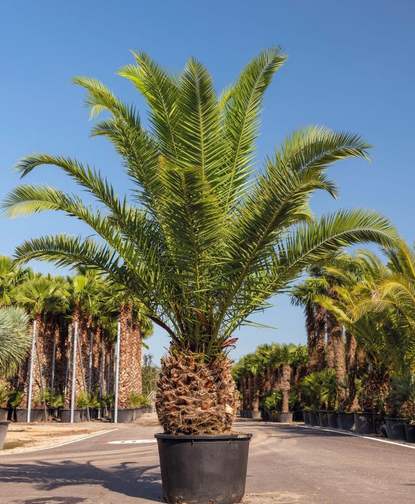 Phoenix canariensis, the Canary Island date palm, is a bold, architectural palm with a stout trunk and a full crown of long, arching fronds. In summer it produces creamy-yellow flowering clusters, followed by small orange-brown dates that add extra seasonal interest. Its strong silhouette makes an instant focal point in lawns, large borders, or along driveways and entrances.