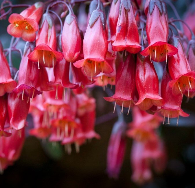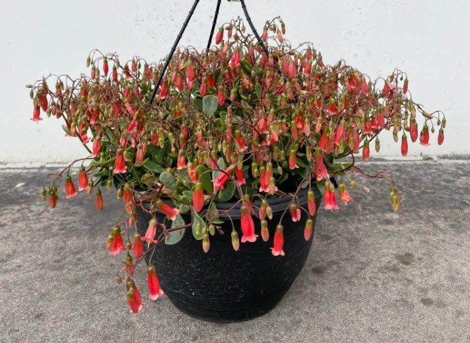 Kalanchoe uniflora Freedom Bells is a stunning trailing succulent that brings a burst of colour to your space. It features orange-red, tubular, bell-shaped flowers that bloom in winter, set against a backdrop of bright green foliage with red fringes. This plant is perfect for indoor settings, particularly those with some direct sunlight. It prefers a well-lit area free from draughts. When it comes to watering, this plant likes its soil to be moist but not wet, and it's advisable to let the soil dry out partially between waterings